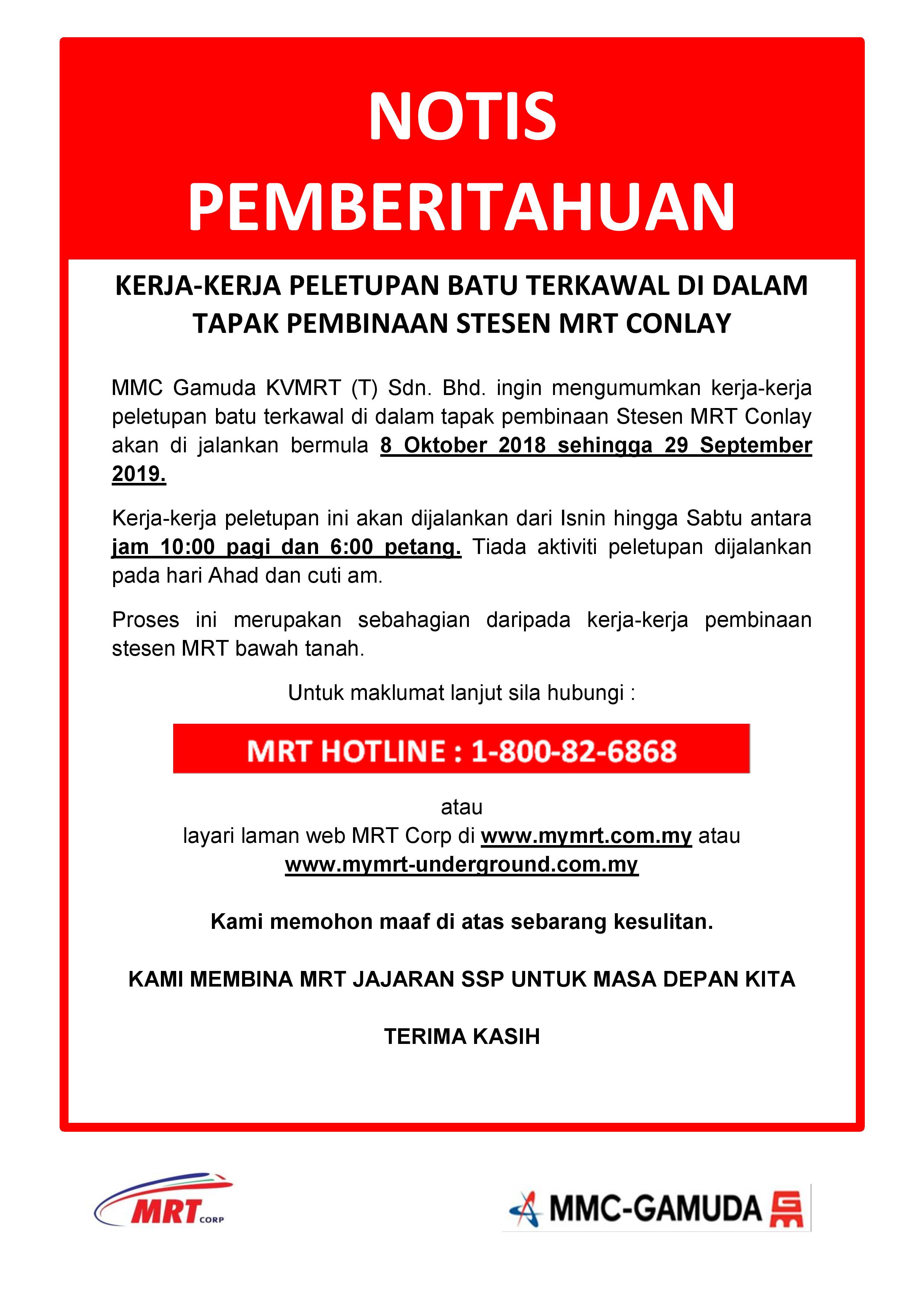 Mrt Corp On Twitter Notis Pemberitahuan Kerja Kerja Peletupan Batu Terkawal Di Dalam Tapak Pembinaan Stesen Mrt Conlay Kltu Https T Co 1sdev6m9ht Twitter
